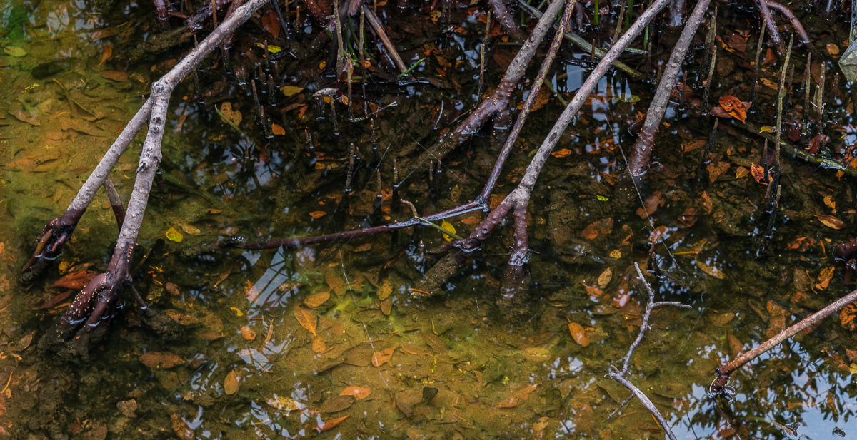 I don’t know what to call this small area off the bay at Quick Point Nature Preserve. Maybe it’s just a tiny inlet or a miniature bayou. The water is never more than a foot deep here, and the ground underneath the water is a different color combination every time I see it. Sometimes it’s purple and orange, sometimes just brown. Sunday it was green and orange. The purple is from sulfur bacteria, I’m pretty sure. Don’t know what makes it so orange. I don’t think it’s iron bacteria, but I suppose it could be. The green could be algae.