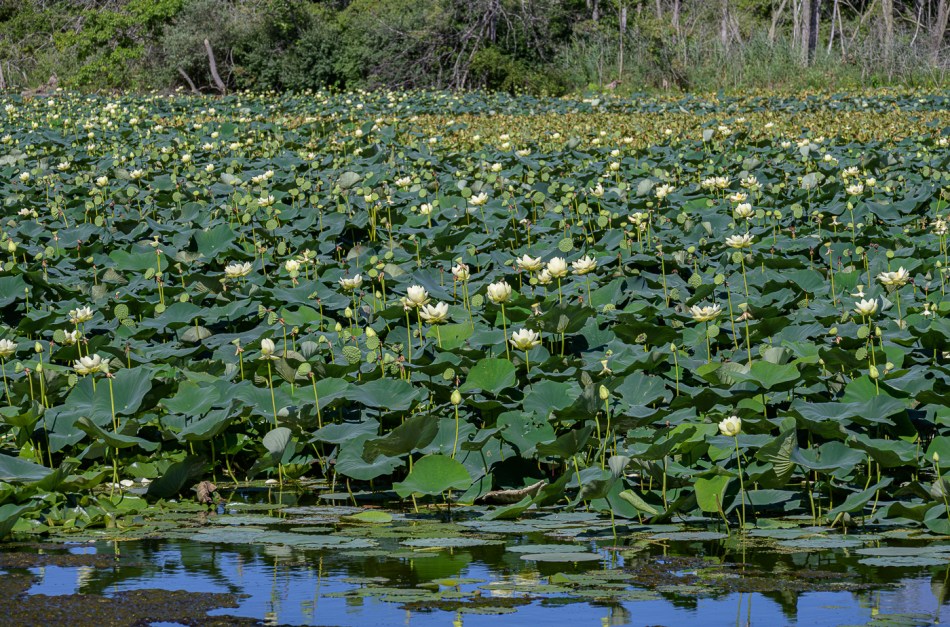 8 The very large swamp is absolutely filled—perhaps overfilled—with lotus plants. We saw big swaths of plants that were brown, as if they had been sprayed with a herbicide.