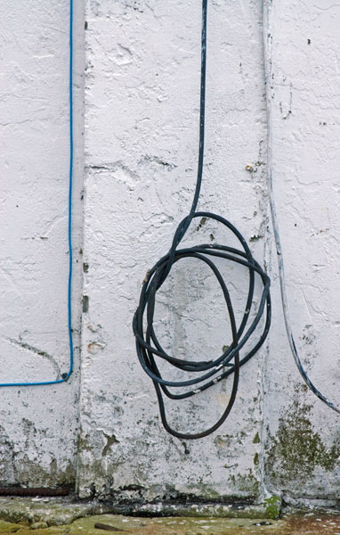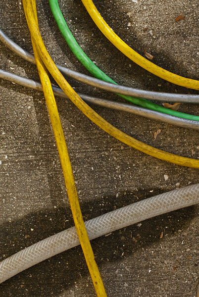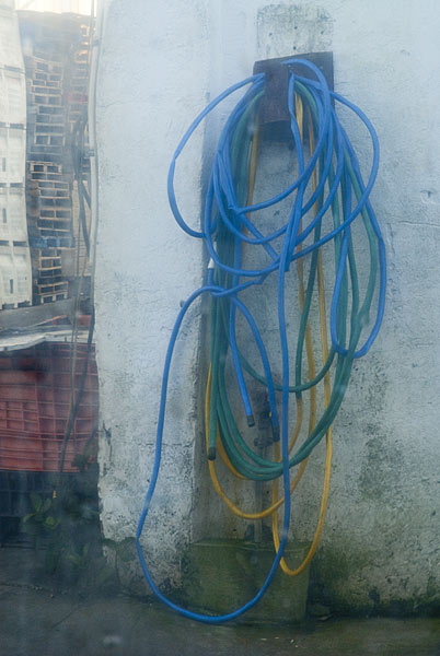 The first roll of film that I shot with an adjustable camera (a pre-1970 Zeiss-Ikon Rangefinder) included photographs of the garden hose coiled up in back of my house. Decades later, I’m still photographing hoses. I found the first three in Cortez, a fishing village north of Sarasota, last month. The first photograph is distorted because it’s of a reflection in the polished-metal back door of a refrigerated truck. That hose and the next two were in front of a fish-processing plant. I took the fourth photograph in the same place two years ago. The hoses in the fifth and sixth photos were in Sarasota, on Main Street during this year’s Thunder by the Bay motorcycle rally and last year at the bay-front marina.