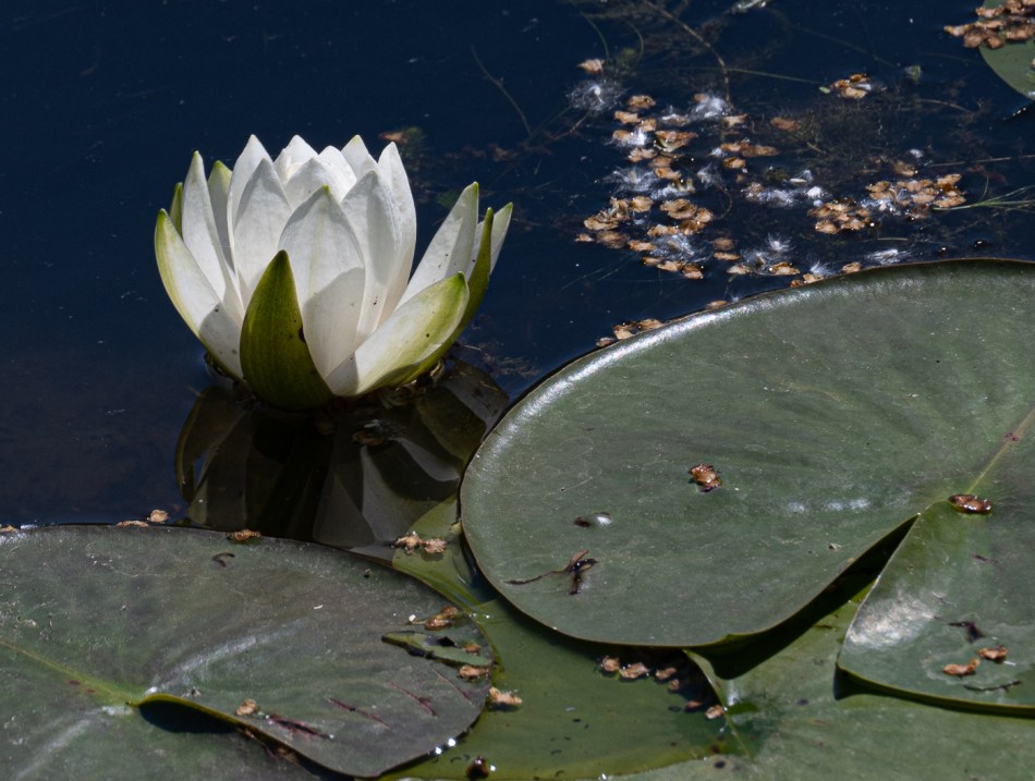 3 While the Lady Bird Johnson Wildflower Center says nothing about the invasive nature of the American native white water lily (Nymphaea odorata), other sites do. The problem can be serious in our western states. Do you wonder what those bits in the water and on the lily pads are? The white fluff is seeds from cottonwood trees (Populus deltoides), and the brown things are fruits of a nearby river birch (Betula nigra) at Island Pond. I’m happy to say that neither tree is considered invasive.