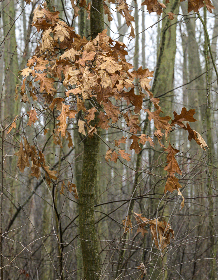 10 A few feet to the right of the trees in #9 a young oak tree hangs on to its leaves.