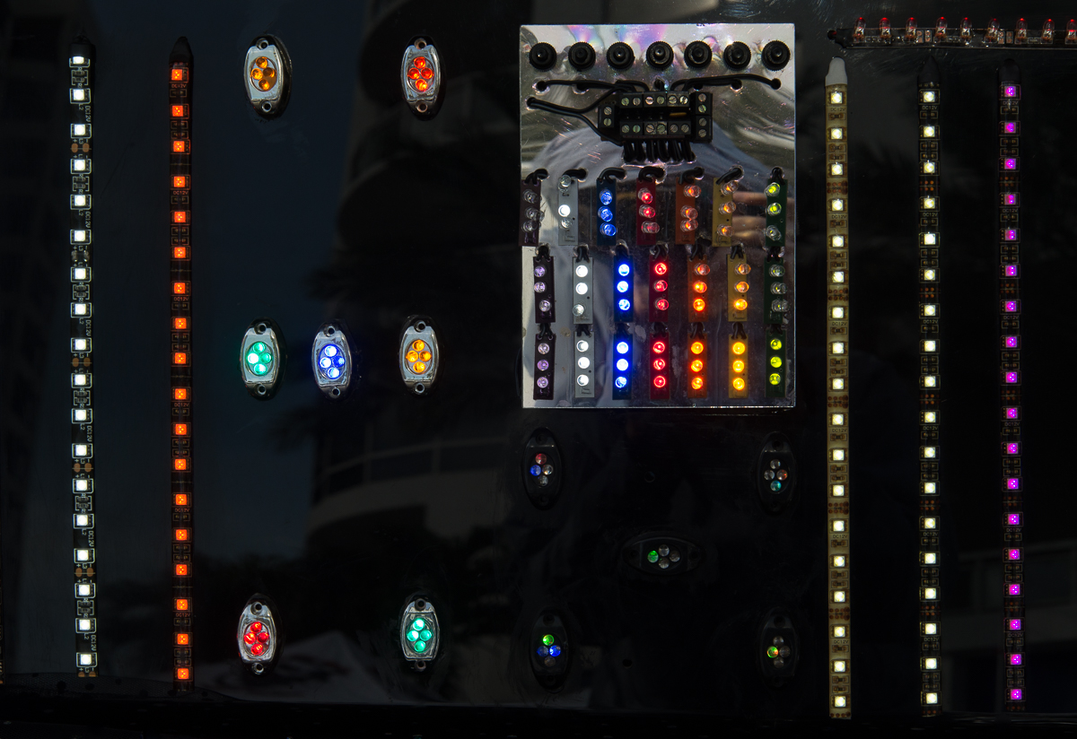 What I was doing, when I discovered the wall, the floor, and the dumpster, was heading toward Sarasota’s annual motorcycle festival. Thunder by the Bay has some elements in common with art fairs, namely vendors’ booths. This photograph is of a vendor’s display of lights to mount on motorcycles. I love to photograph the cyclists and tourists at the festival, but I never have people sign release forms so don’t post those photographs here. I understand that it is legal to photograph people on public streets, but still . . .
