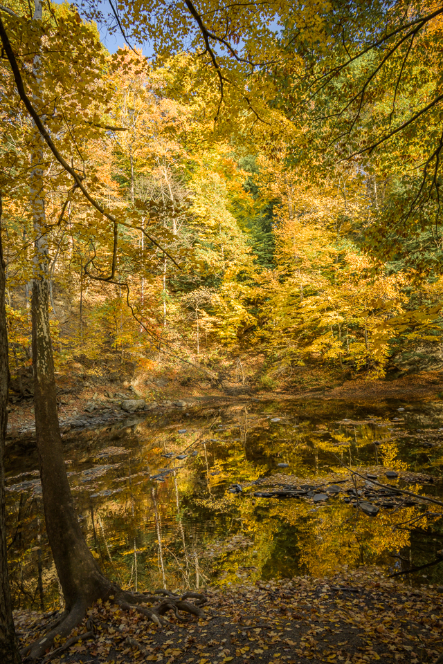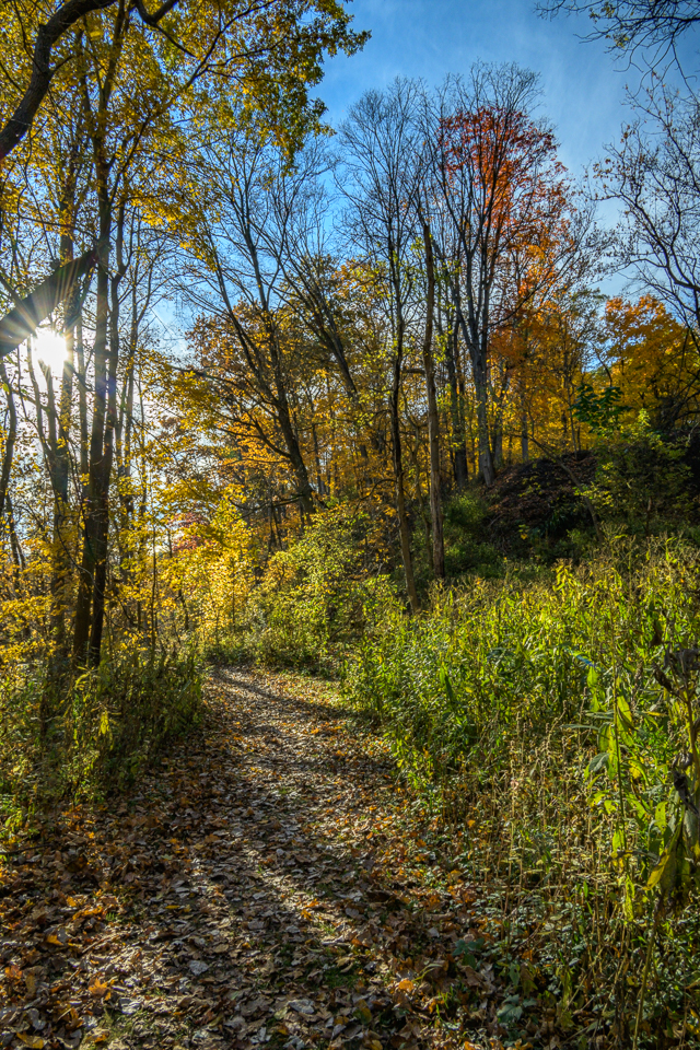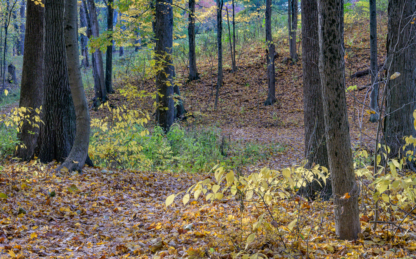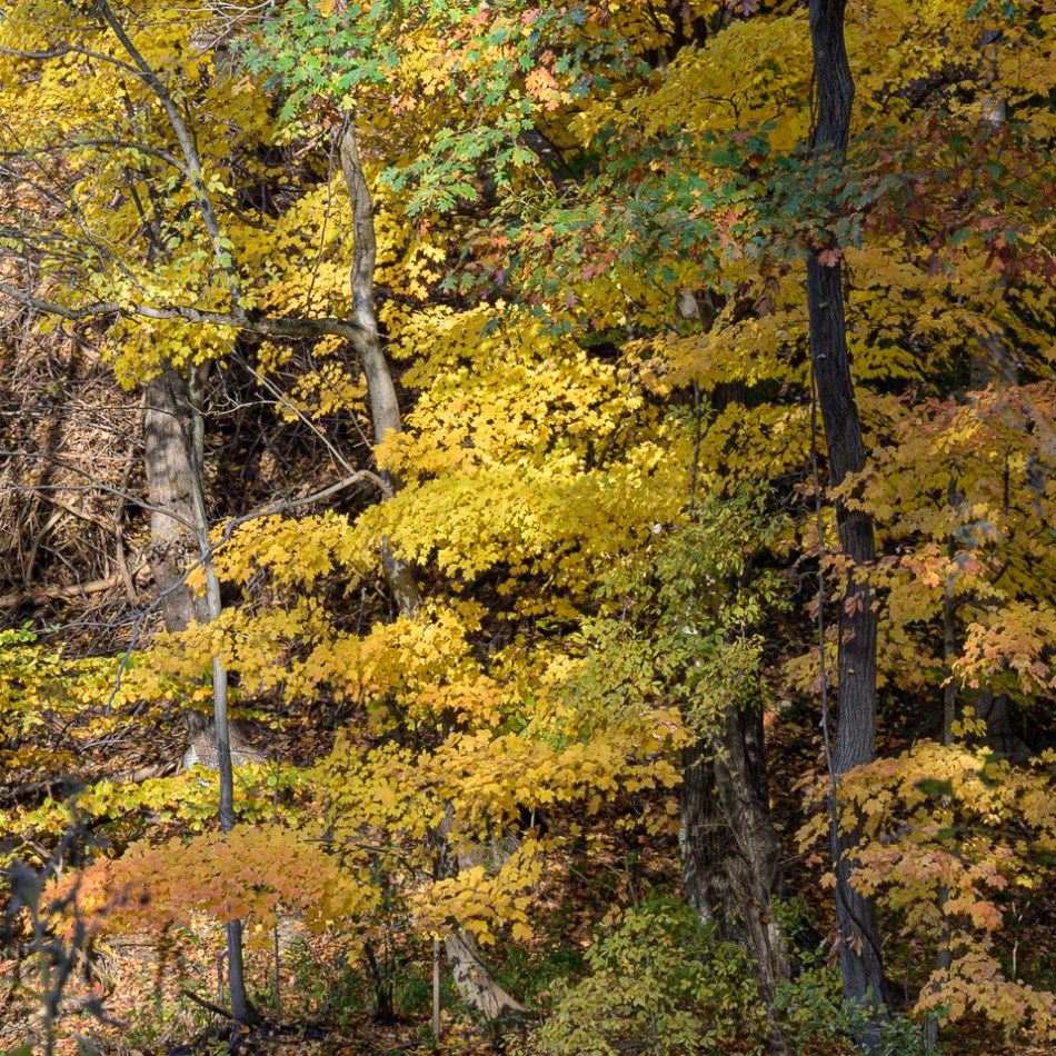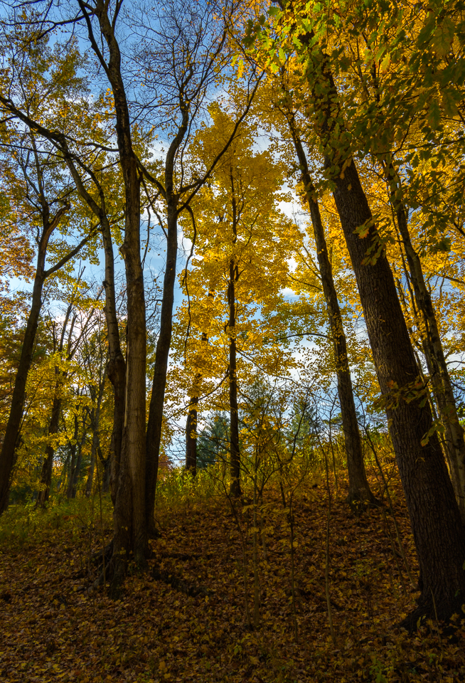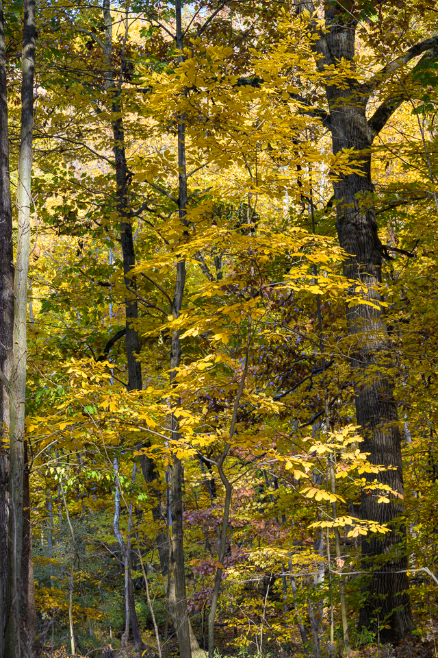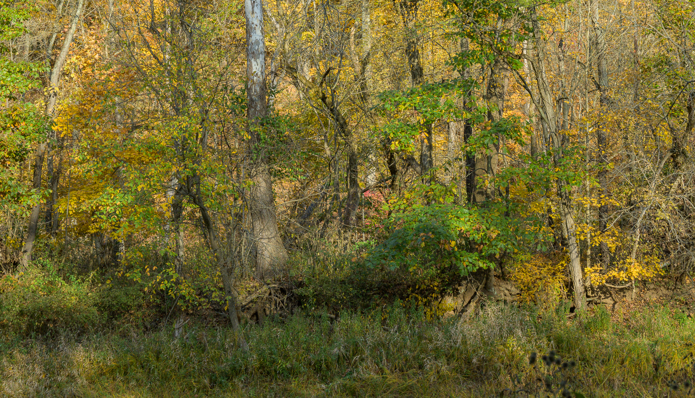 Trees were trying out their new fall colors a week ago Sunday, and I drove over to Schoepfle Garden to see what I could see there. In the comments section of the last post I confessed that I have a hard time making what I consider real landscape photographs. By “real” I mean ones with breadth and depth—panoramas. I’m more comfortable taking tighter shots. As usual, I was disappointed in last week’s download of photos taken with the wide-angle end of my zoom lens. To be surrounded by beauty and feel inadequate to convey it is distressing. But after watching an Alexander Kunz video, I went back—filled with hope—to several of my discards to see if I could improve them. I found I could. They’re still not the quality of landscape photographs I would like to make, but I hope that they display some of the beauty at Schoepfle. Other wider-angle photos were not salvageable except as cropped images. Taken together I hope these photographs convey the reason for the pleasure of a late-afternoon walk through northern Ohio woods.