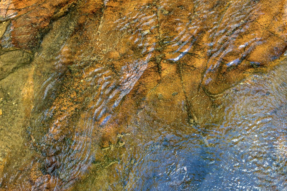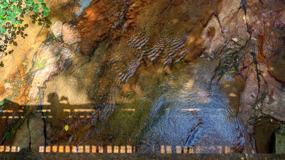 More tamely than taking the little detour illustrated in yesterday’s post, a person can walk over to a bridge and look down on the solid-rock bed of Cucumber Run before the stream falls over the edge of the earth.