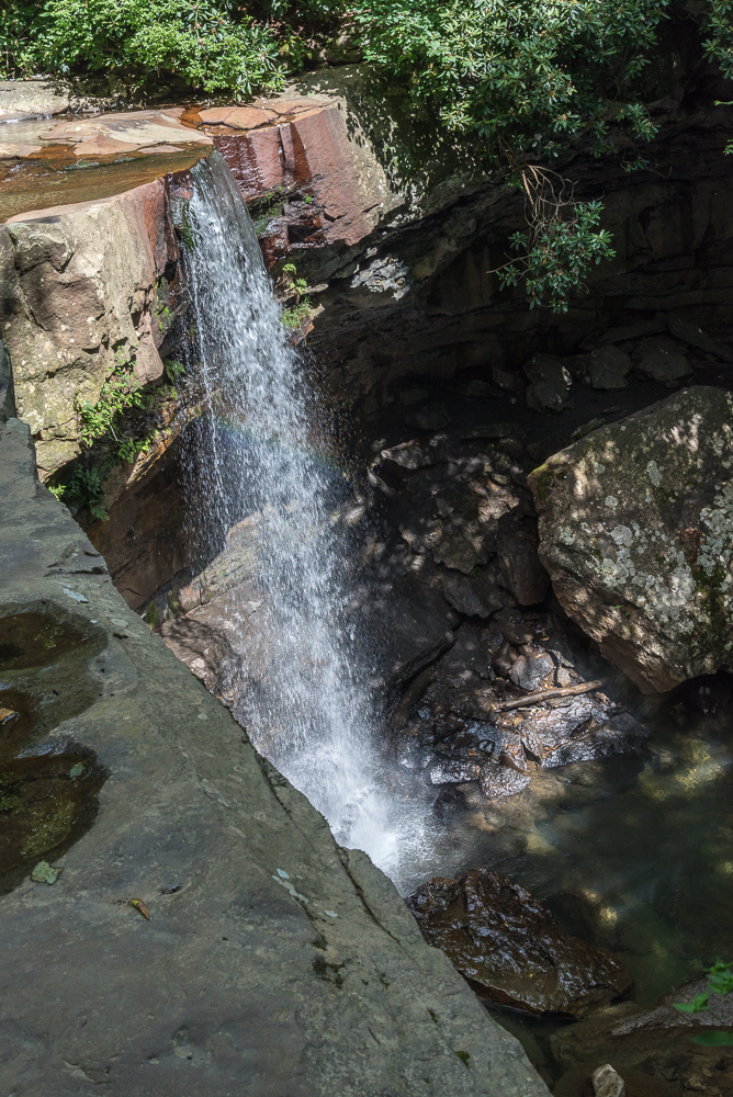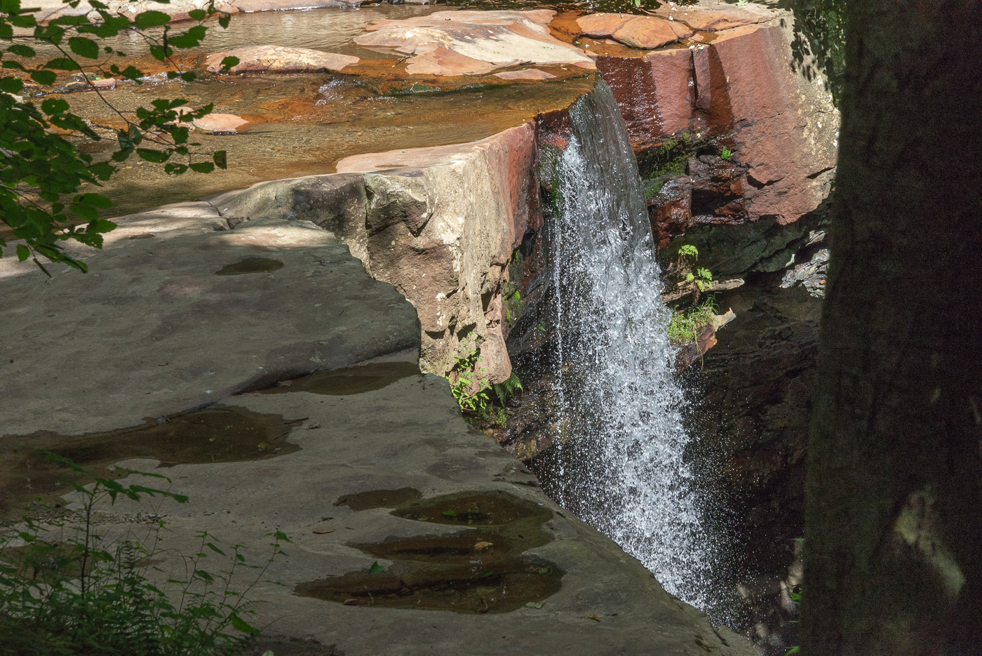 Walking back up the stairs from the place of dark rocks and reflecting pools, you notice that the trail’s low wooden guard rail could very easily be breached and that you could, if you wanted, walk over to where Cucumber Run runs over the edge of the cliff. Hmmm.